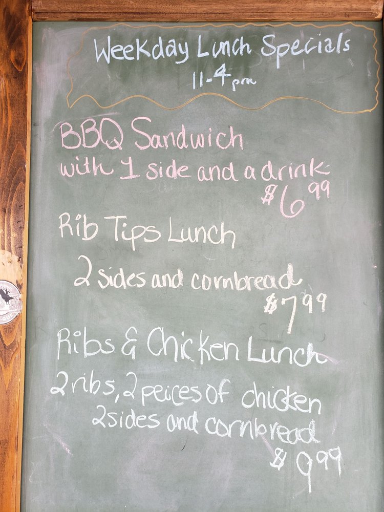 Choice of pulled pork, pulled chicken, brisket, bbq chicken, sausage or chicken breast. Served with two sides and cornbread.